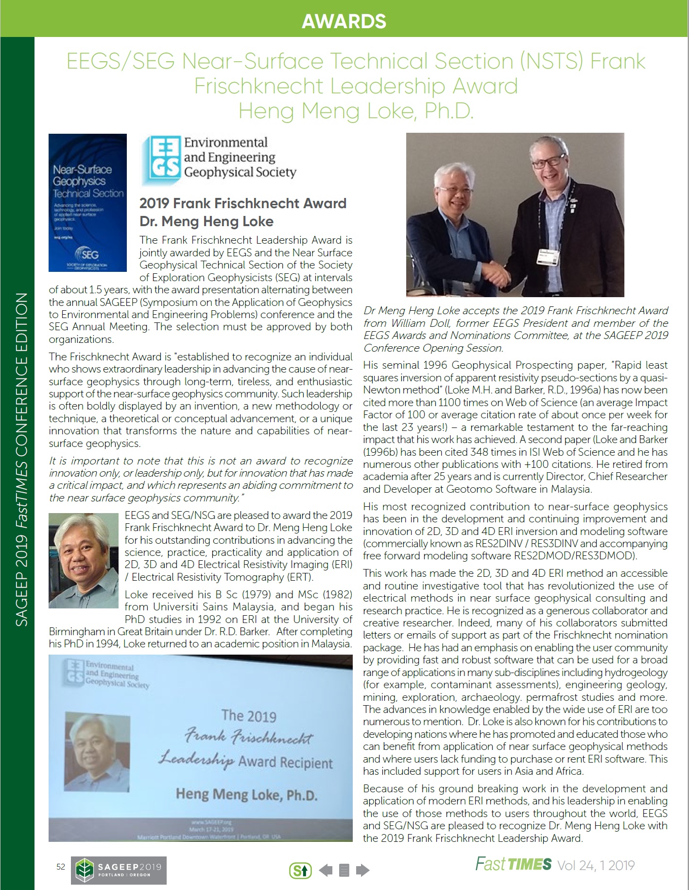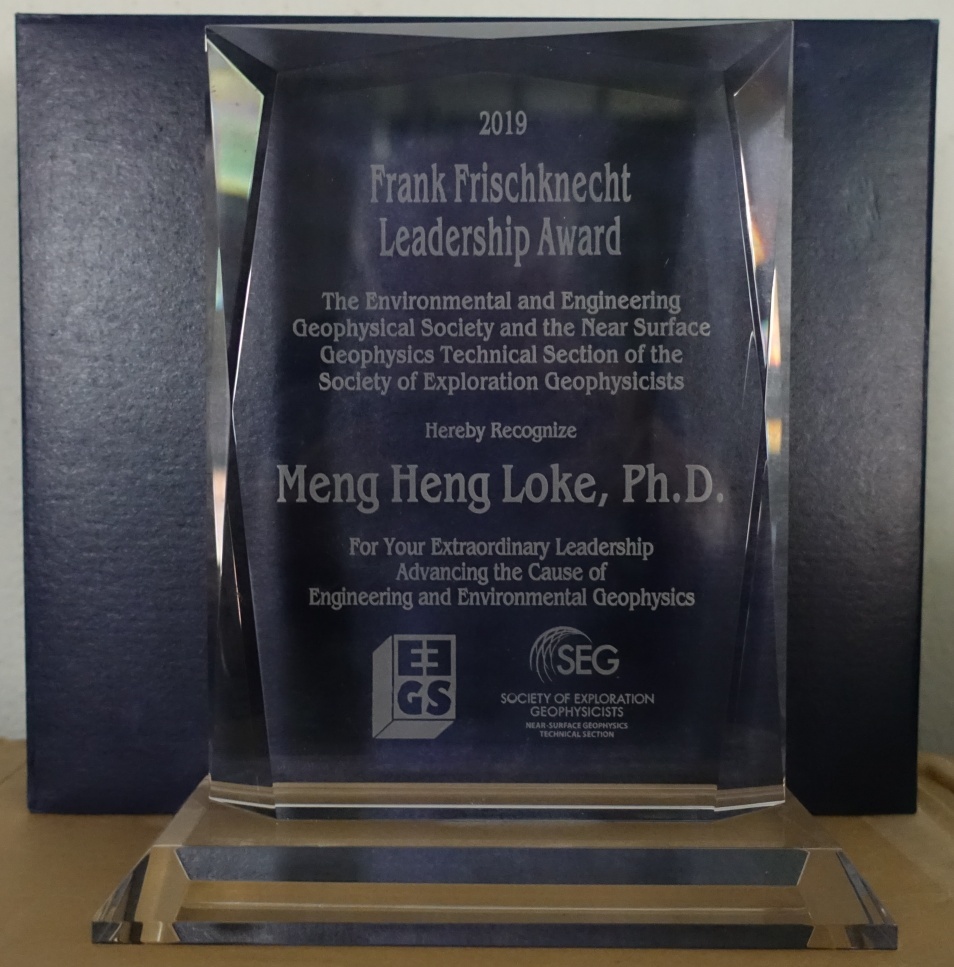 SAGEEP 2019, SEG-EEGS Frank Frischknecht Leadership Award. The second Asian to win this scientific award after a Japanese in 2013, and so far the only one from South East Asia!